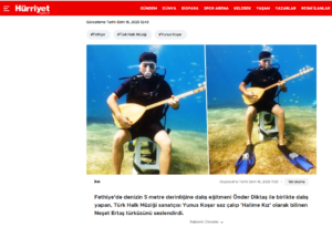 Fethiye’de denizin 5 metre derinliğine dalış eğitmeni Önder Diktaş ile birlikte dalış yapan, Türk Halk Müziği sanatçısı Yunus Koşar saz çalıp ‘Halime Kız’ olarak bilinen Neşet Ertaş türküsünü seslendirdi.